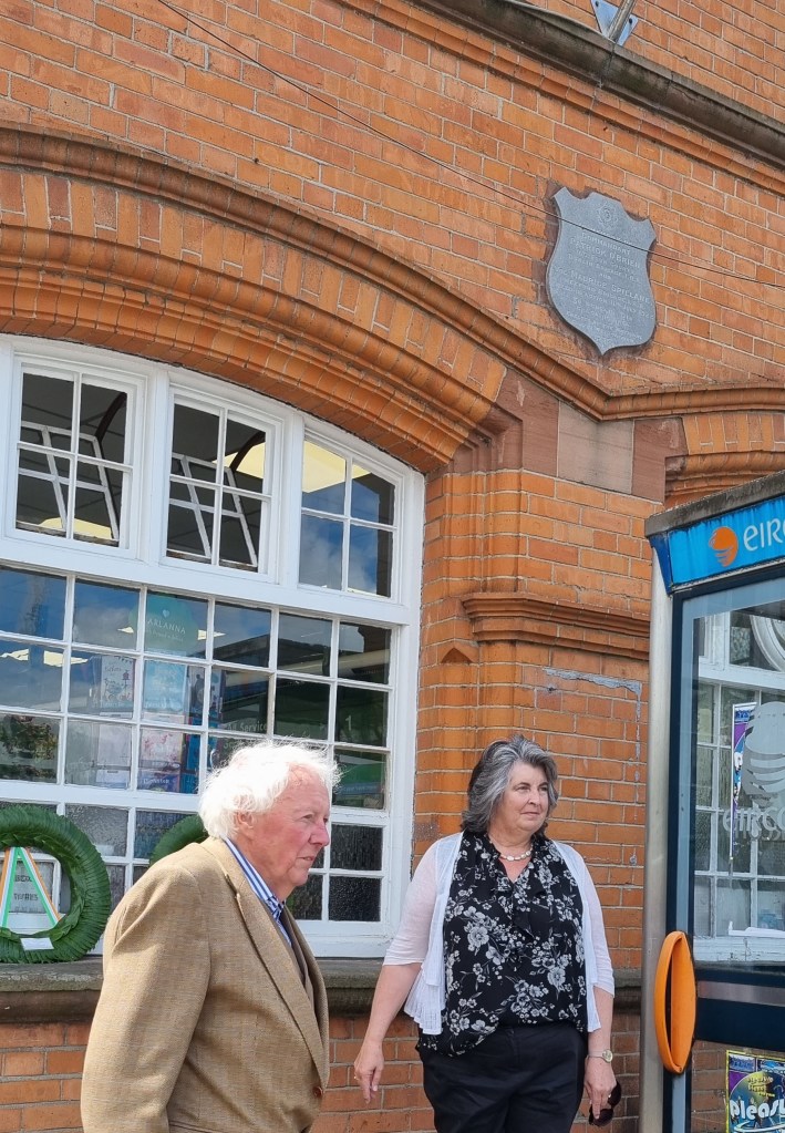 Afterwards the re-enactors marched to the Post Office where Colm O’Brien and Orla McKeown laid wreaths at the site where Patrick (Paddy) O’Brien and Maurice Spilanne were shot during the Battle of Enniscorthy in 1922. Their memory is preserved by a plaque on the Post Office wall.