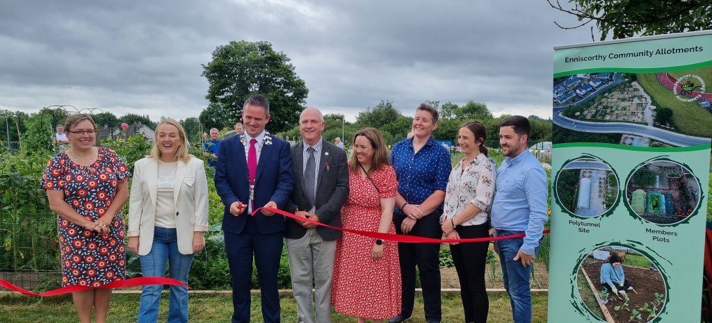 Community history was made in Enniscorthy this morning when Cllr Aidan Browne, Cathaoirleach Enniscorthy Municipal District Council congratulated the committee and cut the ribbon at the official opening of the Enniscorthy Community Allotments at Gort na Gréine.