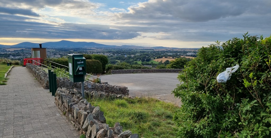 I visited the hill twice today. At the entrance to the hill from the car park is a green dog poo bin – very prominent – and I didn’t check to see if it was full, but I avoided stepping in dog shit – it had been flattened so somebody brought home a souvenir on their shoe – and a bag full of the canine excrement in a white bag is dangling from the hedge beside it! Not a great image.