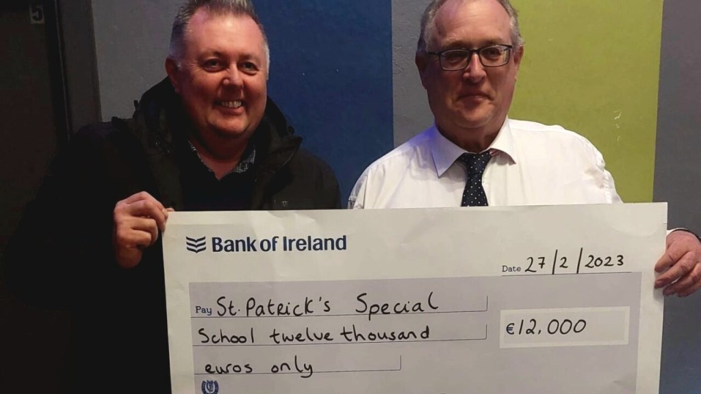 A cheque for €12,000 raised at the Christmas Live Crib held at the Farm Centre, Enniscorthy, was presented to Lee Rogers, Principal at St. Patrick’s Special School, Enniscorthy, by Jer O’Mahony, Chairman of Wexford branch of the Irish Farmers’ Association (IFA) at the annual general meeting of the IFA held in Enniscorthy on Monday night.
