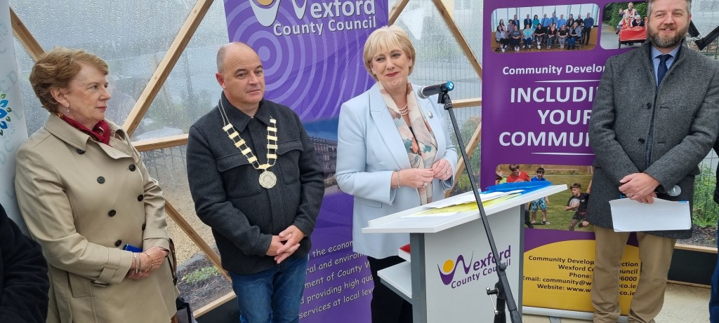 Minister Heather Humphreys, TD, Department of Rural and Community Development was in Enniscorthy this morning to officially launch the Geodesic Dome Training Centre and Sensory Garden at the Enniscorthy Allotments at Gort na Gréine where proceedings were forced indoors due to heavy rain.
