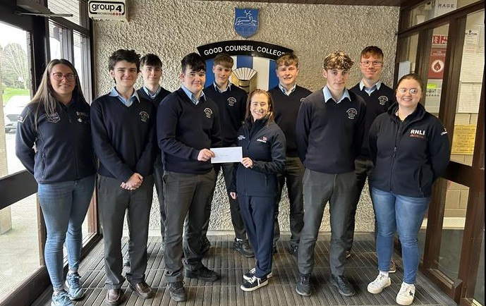 Members of Fethard RNLI travelled to Good Counsel College in New Ross where they were presented with a cheque for over €1,500 that the students raised through a sponsored 5K run on the New Ross Greenway last December.