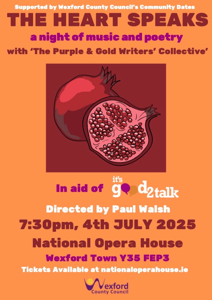 The Purple and Gold Writers’ Collective invites you to spend an evening in the company of Wexford poets and writers, together with guest musicians, to experience and enjoy the special power of the spoken word.