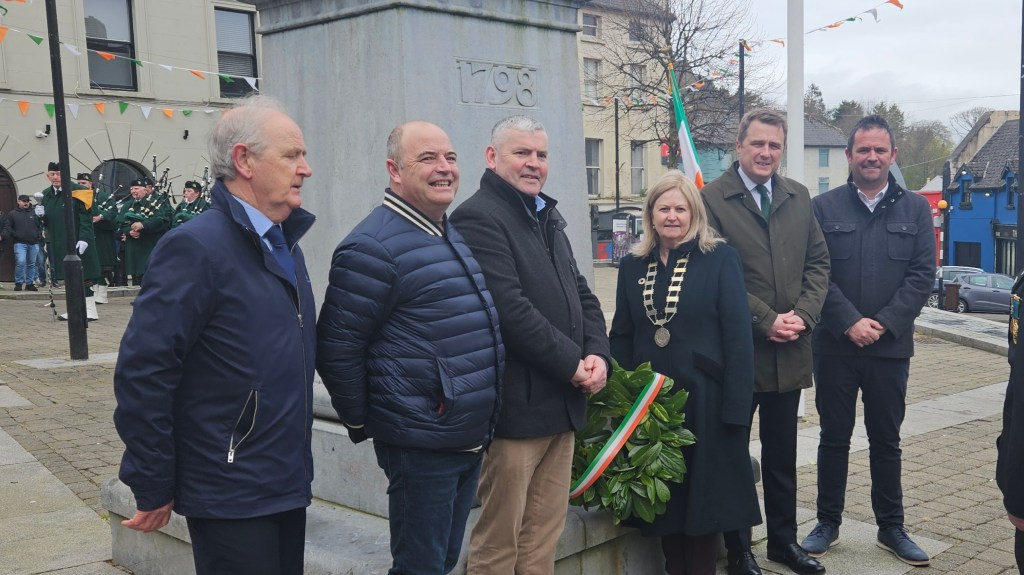 The Colour Party from E.Coy 3rd Batt., Co. Wexford consisting of Capt. Aidan Doyle, Cpl. Gareth Lloyd and Cpl. Francis Harrigan, and St. Colman’s Pipe Band, Ballindaggin, with Pipe Major Jim Byrne lead the parade through Main Street, Pig Market Hill, Wafer Street, and into Market Square, where the Cathaoirleach of Enniscorthy Municipal District Council, Cllr. Barbara Anne Murphy delivered an address and laid a wreath on the 1798 Memorial.
