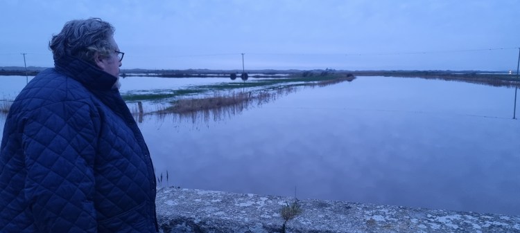 CLLR JIM CODD surveys flooding of farmland at Bridgetown. (File Pic; WexfordLocal.com December 28th 2021).