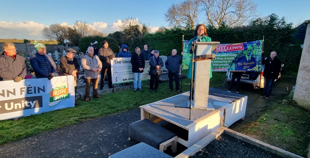 And she continued; “And so here we are. And so here we stand. We, the generation that Mellows foretold, stand at his quiet place. Here we stand for Irish Freedom, For equality, For Unity, For the Republic.